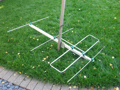 I connected up a bit of coax, and screwed it a short wooden post I had. The end pieces of the folded dipole slipped in and seemed to be fairly secure but probably not brilliant electrically, so will need to secure them properly if I ever use this in anger.